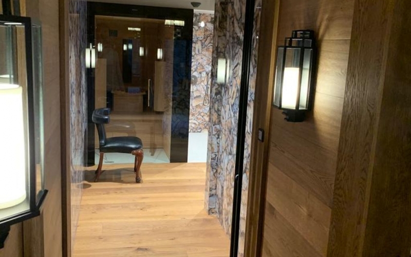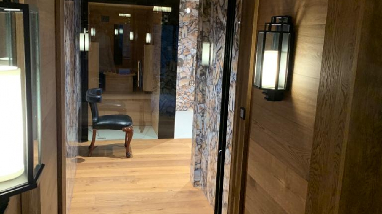 Neviditeľné dvere, z bezpečnostného lepeného skla, v tenkom a zároveň pevnom oceľovom ráme, s priznaným otváraním, jednokrídlové, transparentné, prepúšťajúce svetlo. Účelovo oddeľuje priestory.
